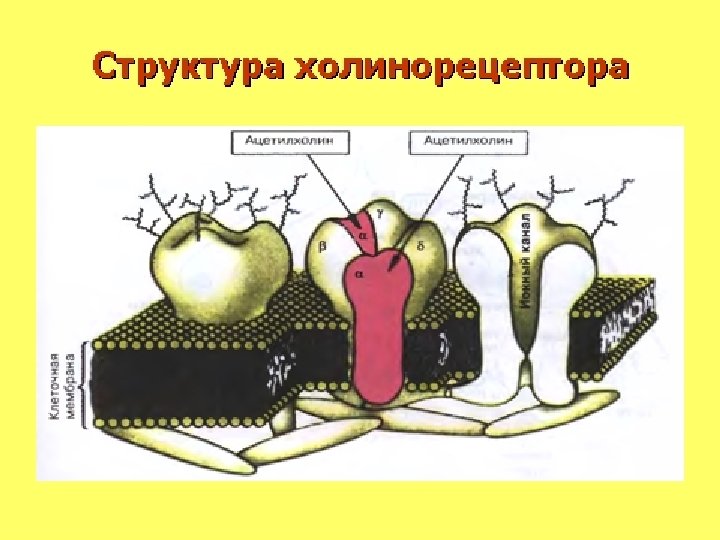 Структура холинергического Na+ АКСОН синапса Холинацетилаза Ац. Ко. А + Холин А АХ Б АХ АТФ Пептиды АХ ауторецептор Сa+ Холинорецепторы пресинаптические АХ АТФ Пептиды Холин Ацетат Гетерорецептор АХ-эстераза АХ М- и N-холинорецепторы Деполяризация АХ-эстераза постсинаптической мембраны