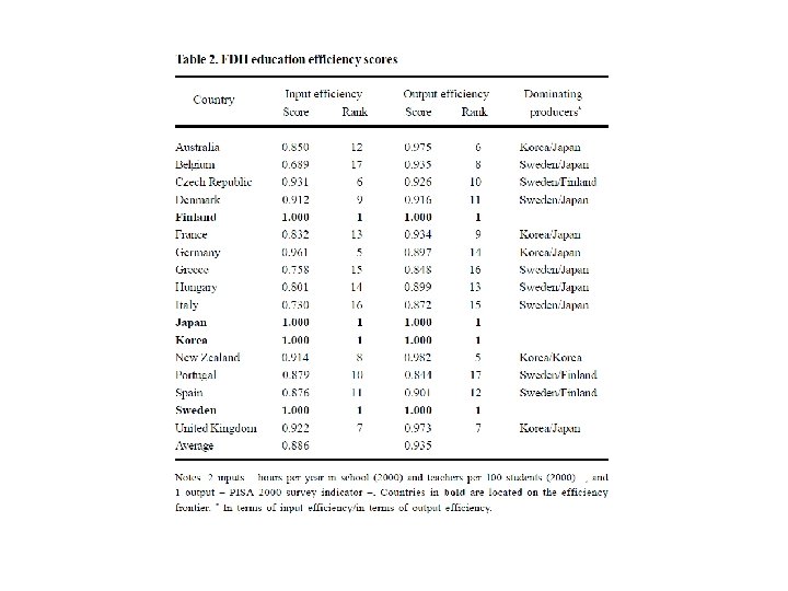 A eficiência das despesas de educação • A eficiência observa-se pelo modo como os inputs se transformam em outputs da educação. • Pode-se utilizar uma estimação da fronteira de produção – Free Disposal Hull (FDH)