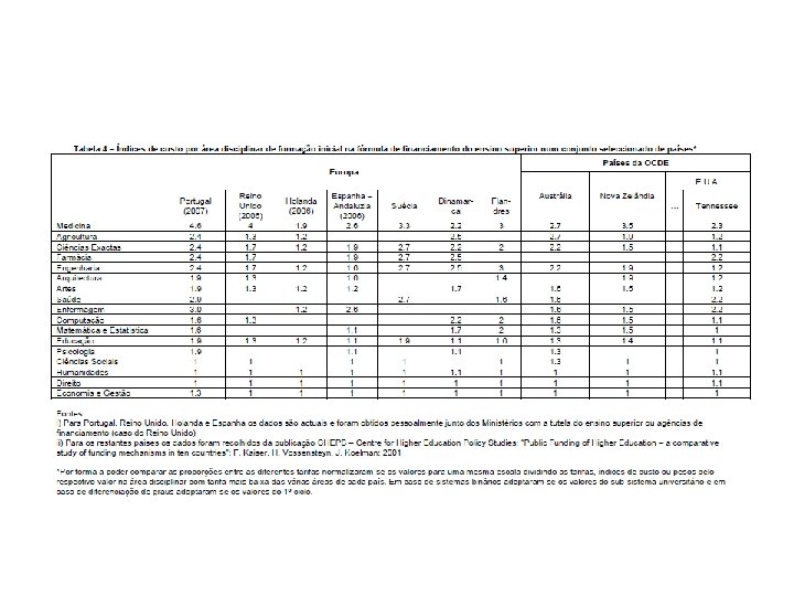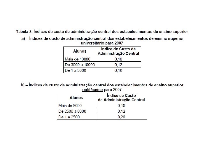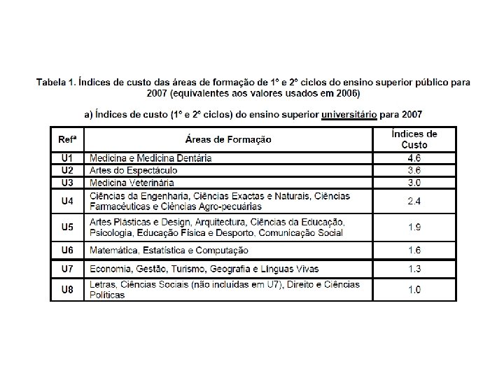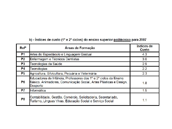 Até 2006 • A fórmula era baseada em rácios alunos/professores e docentes/não docentes; e nos salários médios docentes e não docentes. • Depois eram utilizados factores de qualidade eficiência. • Estes dados eram usados para encontrar custos de referência para cada área e cada instituição.