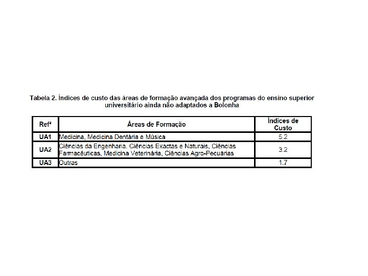 Formação Avançada est/doc est/ndoc Medicina, Med Dent, Espectáculo 5. 0 6. 0 Enfermagem, Med Vet, Tecn Saúde 8. 0 10. 0 Ciência, Eng, Farm, Agr&Pescas 8. 0 10. 0 Arq, CComun, Psi, CEdu, CDesp, APlást 11. 0 22. 0 Matemática, Form. Prof 11. 0 22. 0 Línguas, Economia, Gestão, Ssociais 11. 0 22. 0 Letras, Csociais, Contabilidade 11. 0 22. 0 Direito, CPolíticas 11. 0 22. 0