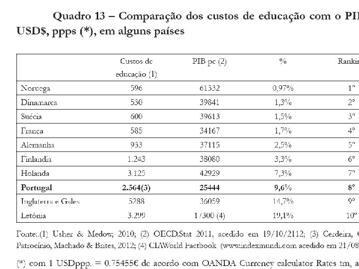 Clements, Benedict, (1999), The Eficiency of Education Expenditure in Portugal, IMF Working Paper No. 99/179. As despesas por aluno em PPC eram modestas A despesa por aluno em relação ao PIB per capita é alta