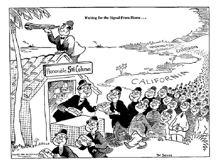 Source Context and Subtext A: Lt. Gen. J. L. De. Witt, Was a veteran of the Philippine Insurrection, the Mexican Border service, and World War I. After the war, most of his Commander of the West Coast service was involved with supply matters. In 1930, he was appointed Quartermaster General of the Army (head of Army Area, letter to the Chief of supply), and later was commandant of the Army War College and in 1939 took command of the Fourth Army and the Staff, U. S. Army, June 5, 1943, of Western Defense Command. Between March 1941 and September 1943, he commanded the Western Defense Area his Final Report; Japanese (the Western portion of the United States). Evacuation from the West Coast 1942. B: The political cartoon “Waiting One of many cartoons produced by Theodor Seuss Geisel (Dr. Seuss) between the years 1941 -1943 as chief editorial for the Signal from Home…” cartoonist for the PM Newspaper. The cartoon depicts common propaganda feelings about individuals of Japanese ancestry living in the United States after the bombing of Pearl Harbor in 1941. Geisel was opposed to the internment of the Japanese. C: “Their Best Way to Show The San Francisco News carried almost daily reports of FBI and police sweeps, and the various proclamations and Loyalty” plans regarding the removal of Japanese Americans. Some news articles were approved by military censors before The San Francisco News publication. In addition, every newspaper editor was excessively careful about printing information of potential use March 6, 1942 to the enemy. An Editorial and cartoon D: The Munson Report In the fall of 1941 President Roosevelt assigned Curtis B. Munson to go to the West Coast and Hawaii to determine the degree of loyalty to be found among the residents of Japanese descent. Munson interviewed Army and United States Marines, intelligence officers, military commanders, city officials, and the FBI. His report was circulated to several Cabinet officials, and on January 9, 1942, a copy was sent to President Roosevelt, along with a memo stating that War Department officials had carefully studied the document. It is unknown whether the president read the report, the memo, or neither. E: The Ringle Report was drafted by the Office of Naval Intelligence, in order to justify the Roosevelt administration in the cases of Hirabayashi v. United States and Korematsu v. United States. F: May 2011, U. S. Solicitor General Neal Katyal, after a year of investigation made the following public statement about the Ringle Report. During World War Two the United States Supreme Court heard two cases related to the Internment of Japanese Americans. In Hirabayashi v. United States (1943), the court held that the restrictions placed on Japanese Americans and resident aliens of Japan served a military and national security interest, and the Court viewed the curfew as a necessary “protective measure. . . in time of war. ” In Korematsu v. United States (1944) the court held that the government was permitted to deny the Japanese their constitutional rights because of military considerations, because a number of Japanese may have been disloyal, the military felt that complete exclusion of persons of Japanese ancestry from certain areas was essential during wartime, and that such exclusion was not beyond the war powers of Congress and the President since their interest in national security was “compelling. ” In 2011, the United States Justice department announced that the report was intentionally withheld from the lawyers representing the United States government in the two cases before the Supreme Court.