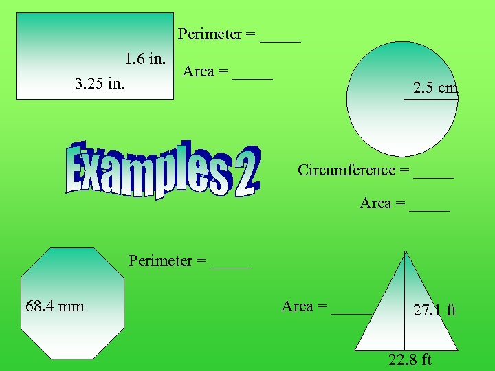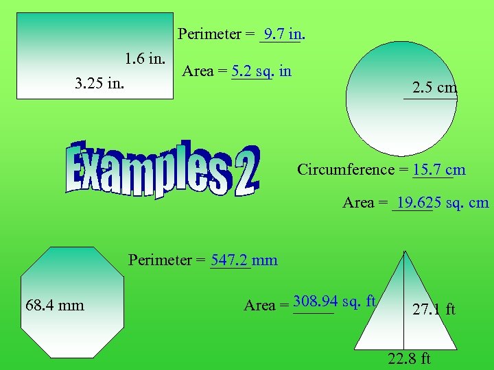 Perimeter = _____ 9. 7 in. 1. 6 in. Area = 5. 2 sq. in _____ 3. 25 in. 2. 5 cm Circumference = _____ 15. 7 cm Area = _____ sq. cm 19. 625 Perimeter = _____ mm 547. 2 68. 4 mm Area = 308. 94 sq. ft _____ 27. 1 ft 22. 8 ft