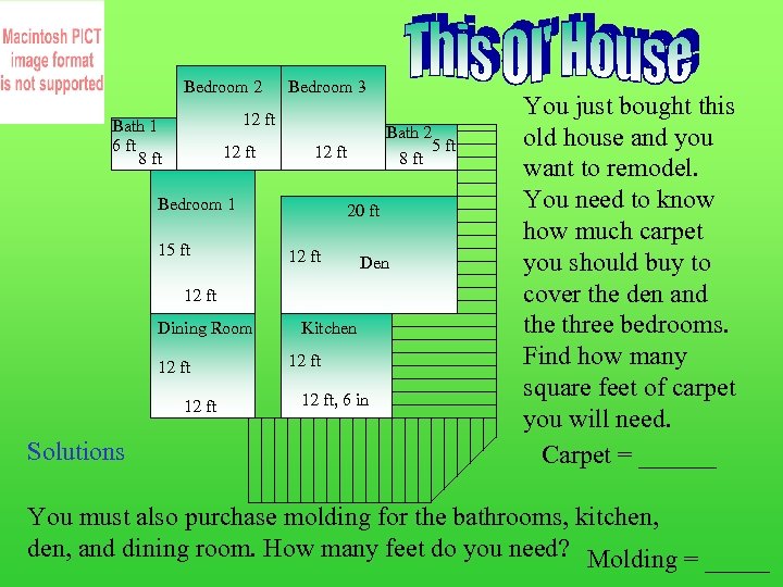 Bedroom 2 Bedroom 3 12 ft Bath 1 6 ft 8 ft 12 ft Bedroom 1 15 ft Bath 2 5 ft 8 ft 20 ft 12 ft Den 12 ft Dining Room 12 ft Solutions Kitchen 12 ft, 6 in You just bought this old house and you want to remodel. You need to know how much carpet you should buy to cover the den and the three bedrooms. Find how many square feet of carpet you will need. Carpet = ______ You must also purchase molding for the bathrooms, kitchen, den, and dining room. How many feet do you need? Molding = _____
