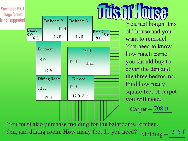Bedroom 2 Bedroom 3 12 ft Bath 1 6 ft 8 ft 12 ft Bedroom 1 15 ft Bath 2 5 ft 8 ft 20 ft 12 ft Den 12 ft Dining Room 12 ft Kitchen 12 ft, 6 in You just bought this old house and you want to remodel. You need to know how much carpet you should buy to cover the den and the three bedrooms. Find how many square feet of carpet you will need. 708 ft Carpet = ______ You must also purchase molding for the bathrooms, kitchen, den, and dining room. How many feet do you need? Molding = _____ 215 ft