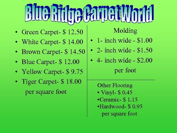 • • • Molding Green Carpet- $ 12. 50 White Carpet- $ 14. 00 • 1 - inch wide - $1. 00 Brown Carpet- $ 14. 50 • 2 - inch wide - $1. 50 • 4 - inch wide - $2. 00 Blue Carpet- $ 12. 00 per foot Yellow Carpet- $ 9. 75 Tiger Carpet- $ 18. 00 Other Flooring per square foot • Vinyl- $ 0. 45 • Ceramic- $ 1. 15 • Hardwood- $ 0. 95 per square foot