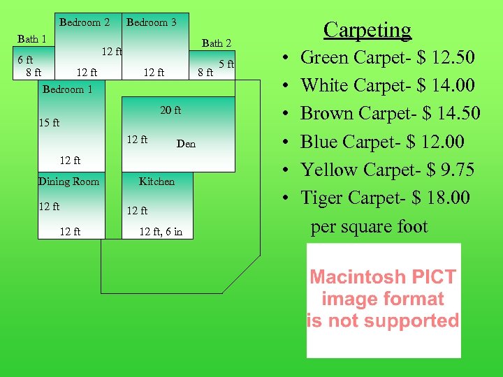 Bedroom 2 Bedroom 3 Bath 1 6 ft 8 ft Bath 2 12 ft Bedroom 1 12 ft 8 ft 20 ft 15 ft 12 ft Den 12 ft Dining Room 12 ft Kitchen 12 ft, 6 in 5 ft Carpeting • • • Green Carpet- $ 12. 50 White Carpet- $ 14. 00 Brown Carpet- $ 14. 50 Blue Carpet- $ 12. 00 Yellow Carpet- $ 9. 75 Tiger Carpet- $ 18. 00 per square foot