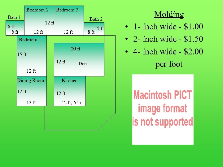 Bedroom 2 Bedroom 3 Bath 1 6 ft 8 ft Bath 2 12 ft Bedroom 1 12 ft 8 ft 20 ft 15 ft 12 ft Den 12 ft Dining Room 12 ft Kitchen 12 ft, 6 in 5 ft Molding • 1 - inch wide - $1. 00 • 2 - inch wide - $1. 50 • 4 - inch wide - $2. 00 per foot