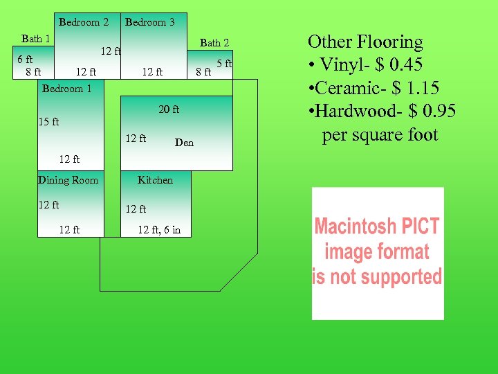 Bedroom 2 Bedroom 3 Bath 1 6 ft 8 ft Bath 2 12 ft Bedroom 1 12 ft 8 ft 20 ft 15 ft 12 ft Den 12 ft Dining Room 12 ft Kitchen 12 ft, 6 in 5 ft Other Flooring • Vinyl- $ 0. 45 • Ceramic- $ 1. 15 • Hardwood- $ 0. 95 per square foot