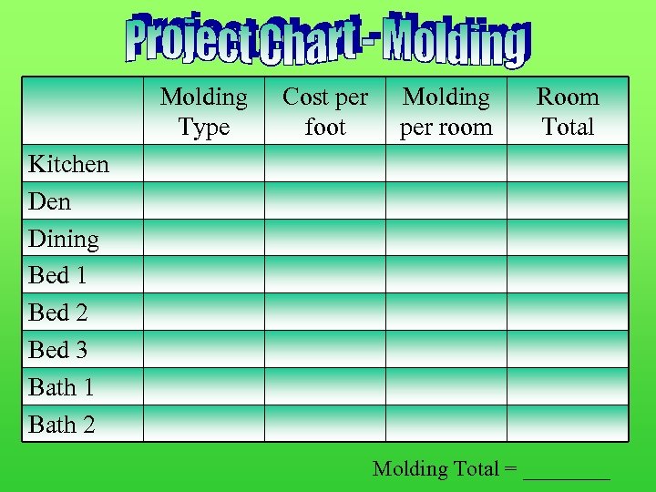 Molding Type Cost per foot Molding per room Room Total Kitchen Dining Bed 1 Bed 2 Bed 3 Bath 1 Bath 2 Molding Total = ____
