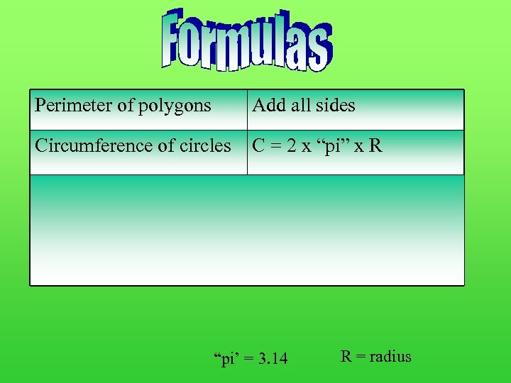 Perimeter of polygons Add all sides Circumference of circles C = 2 x “pi” x R Area of rectangles A=Bx. H Area of circles A = “pi” x R 2 Area of Triangles A=½x. Bx. H “pi’ = 3. 14 R = radius