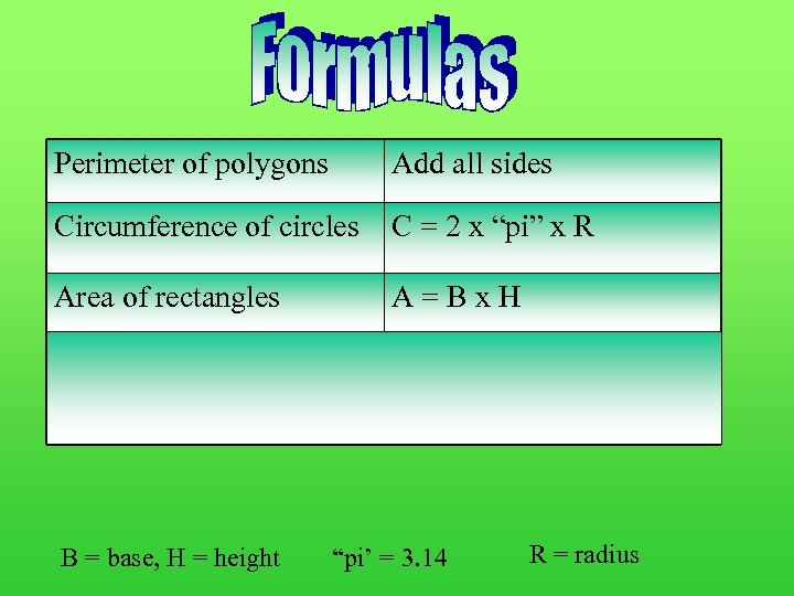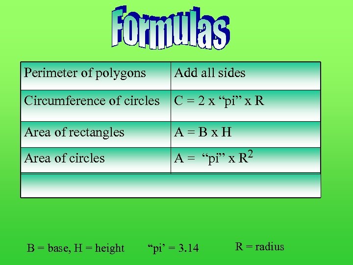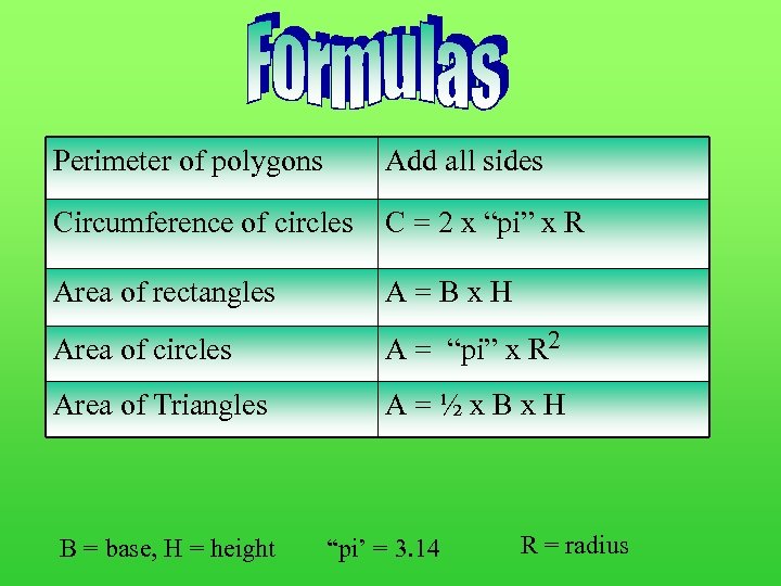 Perimeter of polygons Add all sides Circumference of circles C = 2 x “pi” x R Area of rectangles A=Bx. H Area of circles A = “pi” x R 2 Area of Triangles A=½x. Bx. H B = base, H = height “pi’ = 3. 14 R = radius