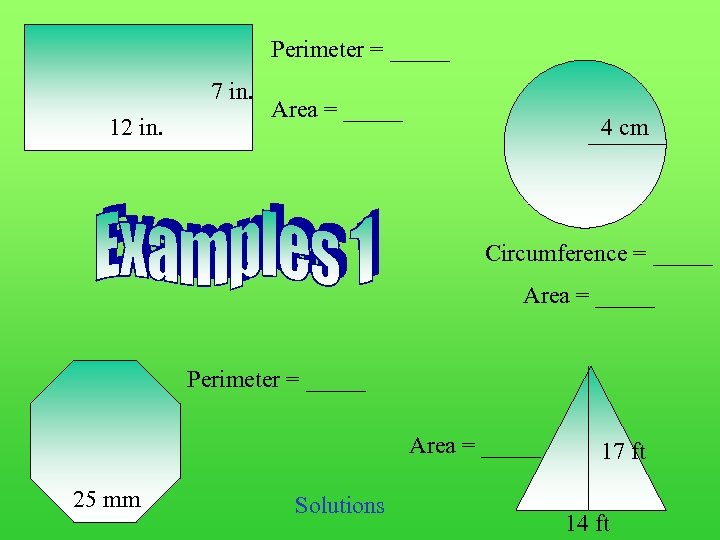 Perimeter = _____ 7 in. 12 in. Area = _____ 4 cm Circumference = _____ Area = _____ Perimeter = _____ Area = _____ 25 mm Solutions 17 ft 14 ft
