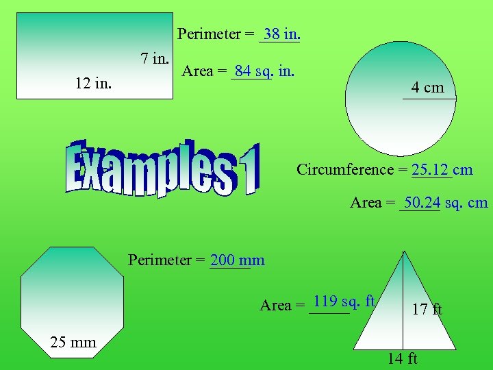 Perimeter = _____ 38 in. 7 in. 12 in. Area = _____ in. 84 sq. 4 cm Circumference = _____cm 25. 12 Area = _____ sq. cm 50. 24 Perimeter = _____ 200 mm 119 sq. Area = _____ ft 25 mm 17 ft 14 ft
