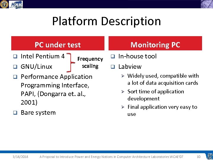Platform Description PC under test q q Intel Pentium 4 Frequency scaling GNU/Linux Performance Application Programming Interface, PAPI, (Dongarra et. al. , 2001) Bare system 3/18/2018 Monitoring PC q q In-house tool Labview Ø Ø Ø Widely used, compatible with a lot of data acquisition cards Sort time of application development Final application very easy to use A Proposal to Introduce Power and Energy Notions in Computer Architecture Laboratories WCAE'07 10