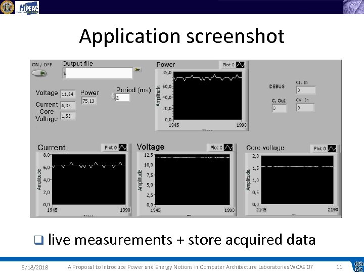 Application screenshot q live measurements + store acquired data 3/18/2018 A Proposal to Introduce Power and Energy Notions in Computer Architecture Laboratories WCAE'07 11