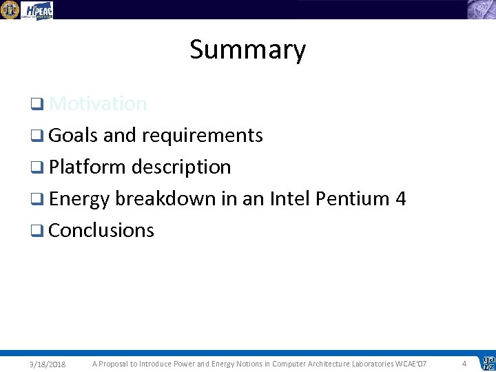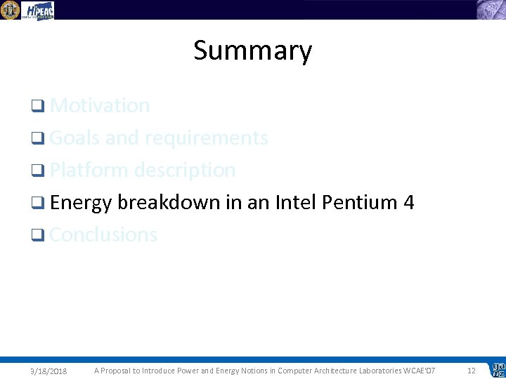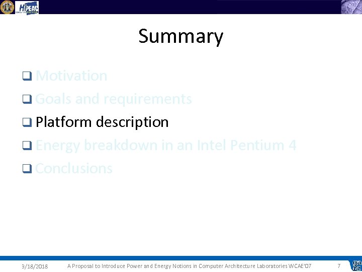 Summary q Motivation q Goals and requirements q Platform description q Energy breakdown in an Intel Pentium 4 q Conclusions 3/18/2018 A Proposal to Introduce Power and Energy Notions in Computer Architecture Laboratories WCAE'07 4