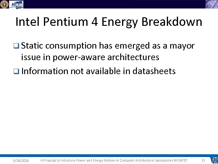 Intel Pentium 4 Energy Breakdown q Static consumption has emerged as a mayor issue in power-aware architectures q Information not available in datasheets 3/18/2018 A Proposal to Introduce Power and Energy Notions in Computer Architecture Laboratories WCAE'07 13