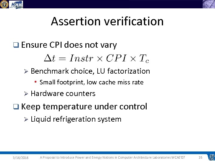 Assertion verification q Ensure CPI does not vary Ø Benchmark choice, LU factorization • Small footprint, low cache miss rate Ø Hardware counters q Keep temperature under control Ø Liquid refrigeration system 3/18/2018 A Proposal to Introduce Power and Energy Notions in Computer Architecture Laboratories WCAE'07 16