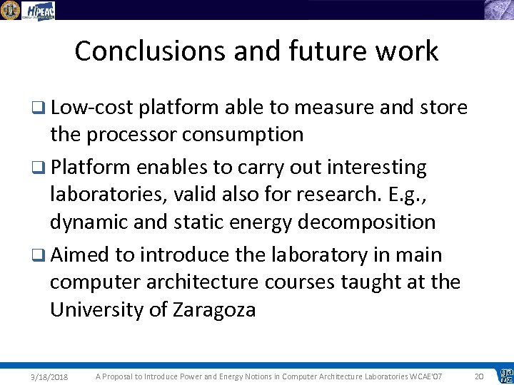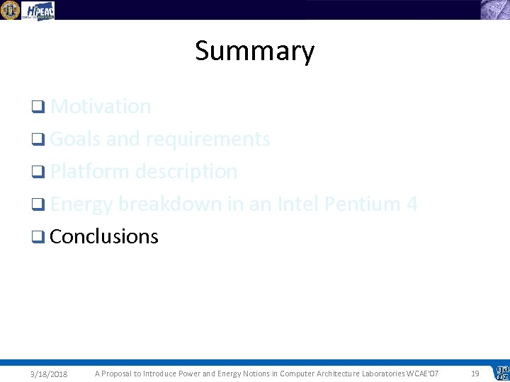 Summary q Motivation q Goals and requirements q Platform description q Energy breakdown in an Intel Pentium 4 q Conclusions 3/18/2018 A Proposal to Introduce Power and Energy Notions in Computer Architecture Laboratories WCAE'07 19