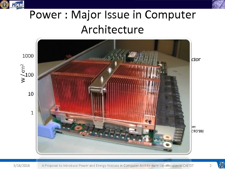 Power : Major Issue in Computer Architecture W / cm 2 Nuclear reactor Pentium II Pentium i 386 i 486 Pentium 4 Pentium III Pentium Pro Technology from older to newer (μm) 3/18/2018 Core DUO Adapted from Pollack (MICRO’ 99) A Proposal to Introduce Power and Energy Notions in Computer Architecture Laboratories WCAE'07 2