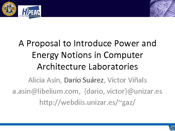 A Proposal to Introduce Power and Energy Notions in Computer Architecture Laboratories Alicia Asín, Darío Suárez, Víctor Viñals ga. Z – DIIS – I 3 A Universidad de Zaragoza Hi. PEAC Network of Excellence