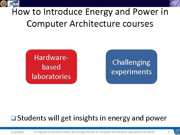 How to Introduce Energy and Power in Computer Architecture courses Hardwarebased laboratories Challenging experiments q Students will get insights in energy and power 3/18/2018 A Proposal to Introduce Power and Energy Notions in Computer Architecture Laboratories WCAE'07 3
