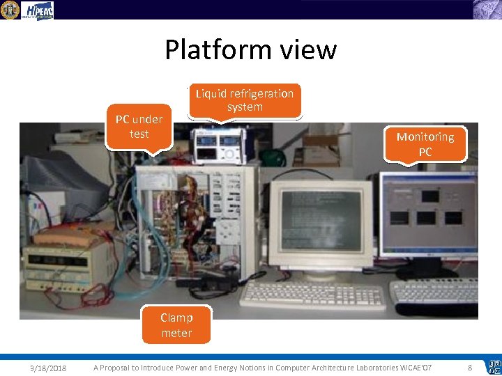 Platform view PC under test Liquid refrigeration system Monitoring PC Clamp meter 3/18/2018 A Proposal to Introduce Power and Energy Notions in Computer Architecture Laboratories WCAE'07 8