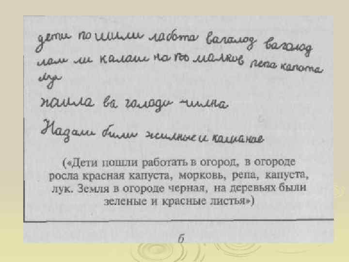 В специальной серии опытов Л. К. Назарова показала, насколько беспомощен больной, когда ему приходится уточнять звуковой состав текста, в котором встречаются замены близких по артикуляции букв. Больному предлагается текст, построенный по образцу приведенного ниже, где встречаются ошибки, заключающиеся в замене одного другим, или близким по звучанию, или близким по артикуляции (гоморганным) звуком.