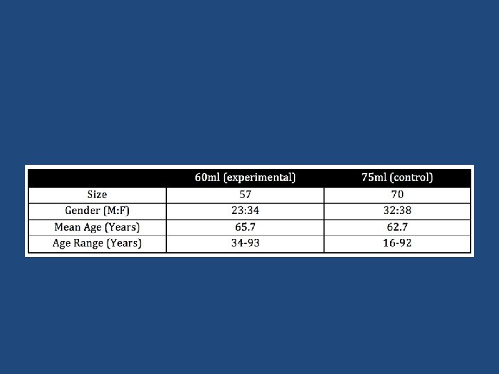 Results: • There was no significant difference between the groups in either age (p = 0. 35) or sex (p = 0. 42). • The mean opacification in the main, right and left pulmonary arteries are given in Table 2. Note that although the values are higher with 75 ml of contrast medium, the difference is not significant enough to affect the overall image quality