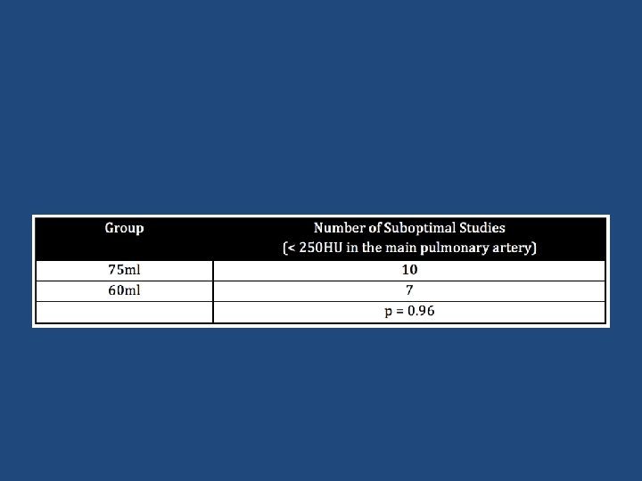 Results (2) Group Mean dose (g/ Iodine) Opacification Pulmonary Trunk (HU) Suboptimal Studies (<250 HU Pulmonary Trunk) 100 ml 300 mg I/ml 29. 53 (sd = 0. 587) (95% CI 29. 3829. 67) 331. 39 (sd = 82. 62) (95% CI 311. 5351. 2) 13 (18%) 75 ml 350 mg I/ml 26. 25 (sd = 0) (95% CI 26. 25) 365 (sd = 118. 38) (95% CI 336. 7393. 3) 12 (17%) p value p < 0. 0001 p = 0. 0546 p = 0. 83