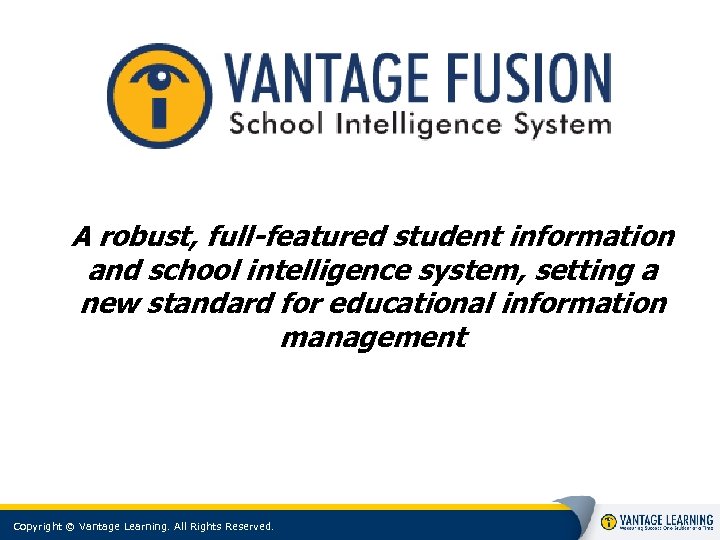 A robust, full-featured student information and school intelligence system, setting a new standard for educational information management Copyright © Vantage Learning. All Rights Reserved. 1