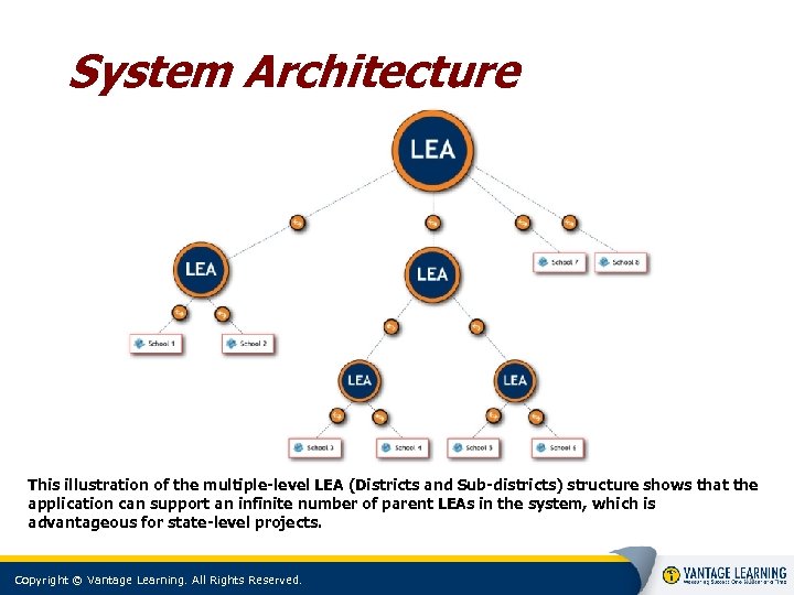 System Architecture This illustration of the multiple-level LEA (Districts and Sub-districts) structure shows that the application can support an infinite number of parent LEAs in the system, which is advantageous for state-level projects. Copyright © Vantage Learning. All Rights Reserved. 10