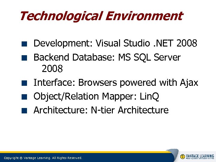 Technological Environment Development: Visual Studio. NET 2008 Backend Database: MS SQL Server 2008 Interface: Browsers powered with Ajax Object/Relation Mapper: Lin. Q Architecture: N-tier Architecture Copyright © Vantage Learning. All Rights Reserved.
