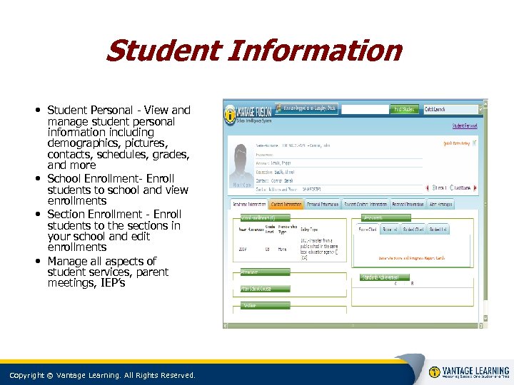 Student Information • Student Personal - View and manage student personal information including demographics, pictures, contacts, schedules, grades, and more • School Enrollment- Enroll students to school and view enrollments • Section Enrollment - Enroll students to the sections in your school and edit enrollments • Manage all aspects of student services, parent meetings, IEP’s Copyright © Vantage Learning. All Rights Reserved.