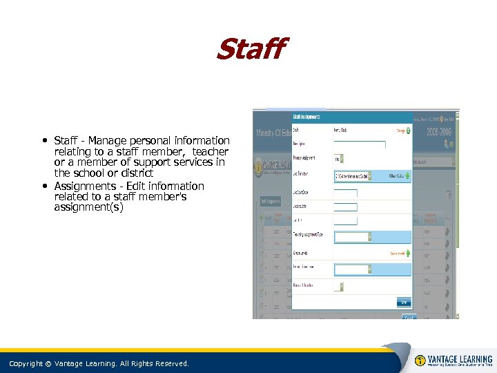 Staff • Staff - Manage personal information relating to a staff member, teacher or a member of support services in the school or district • Assignments - Edit information related to a staff member's assignment(s) Copyright © Vantage Learning. All Rights Reserved.