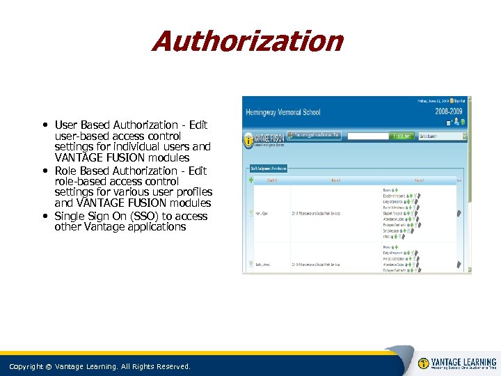 Authorization • User Based Authorization - Edit user-based access control settings for individual users and VANTAGE FUSION modules • Role Based Authorization - Edit role-based access control settings for various user profiles and VANTAGE FUSION modules • Single Sign On (SSO) to access other Vantage applications Copyright © Vantage Learning. All Rights Reserved.