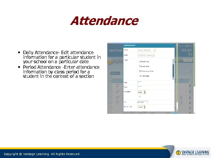 Attendance • Daily Attendance- Edit attendance information for a particular student in your school on a particular date • Period Attendance -Enter attendance information by class period for a student in the context of a section Copyright © Vantage Learning. All Rights Reserved.