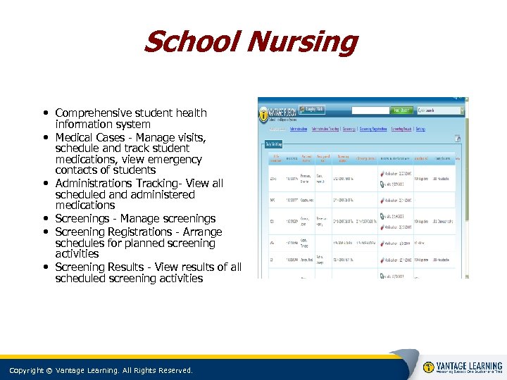 School Nursing • Comprehensive student health information system • Medical Cases - Manage visits, schedule and track student medications, view emergency contacts of students • Administrations Tracking- View all scheduled and administered medications • Screenings - Manage screenings • Screening Registrations - Arrange schedules for planned screening activities • Screening Results - View results of all scheduled screening activities Copyright © Vantage Learning. All Rights Reserved.