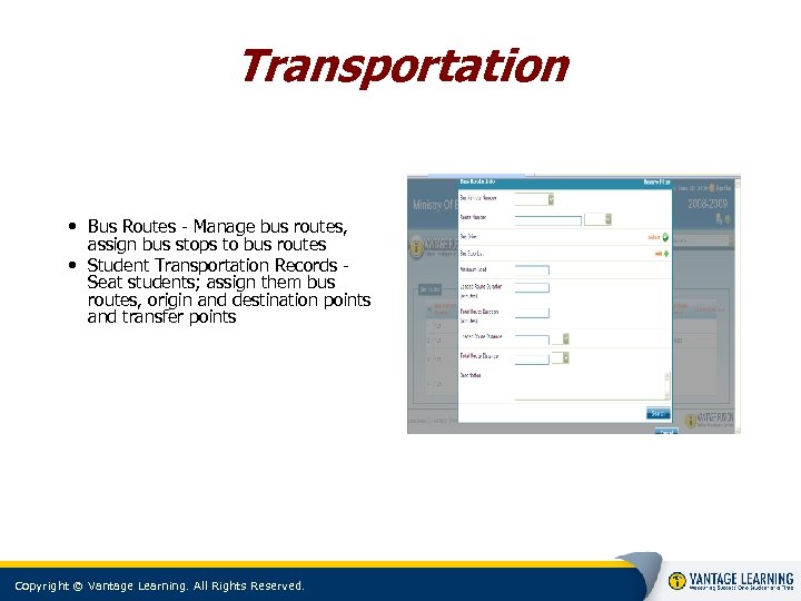 Transportation • Bus Routes - Manage bus routes, assign bus stops to bus routes • Student Transportation Records Seat students; assign them bus routes, origin and destination points and transfer points Copyright © Vantage Learning. All Rights Reserved.
