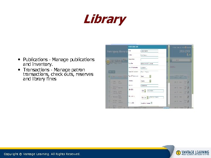 Library • Publications - Manage publications and inventory. • Transactions - Manage patron transactions, check outs, reserves and library fines Copyright © Vantage Learning. All Rights Reserved.