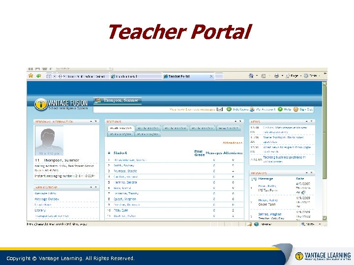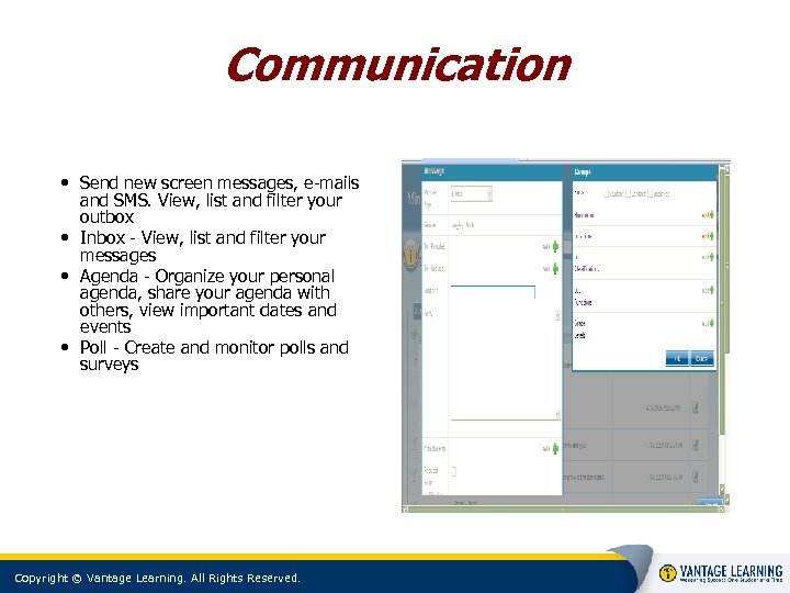 Communication • Send new screen messages, e-mails and SMS. View, list and filter your outbox • Inbox - View, list and filter your messages • Agenda - Organize your personal agenda, share your agenda with others, view important dates and events • Poll - Create and monitor polls and surveys Copyright © Vantage Learning. All Rights Reserved.