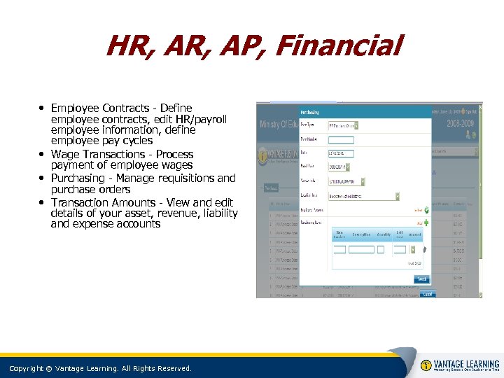 HR, AP, Financial • Employee Contracts - Define employee contracts, edit HR/payroll employee information, define employee pay cycles • Wage Transactions - Process payment of employee wages • Purchasing - Manage requisitions and purchase orders • Transaction Amounts - View and edit details of your asset, revenue, liability and expense accounts Copyright © Vantage Learning. All Rights Reserved.