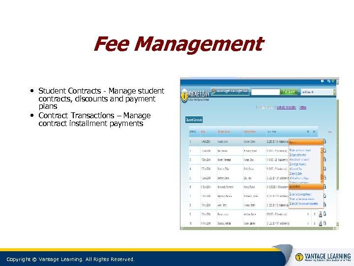 Fee Management • Student Contracts - Manage student contracts, discounts and payment plans • Contract Transactions – Manage contract installment payments Copyright © Vantage Learning. All Rights Reserved.