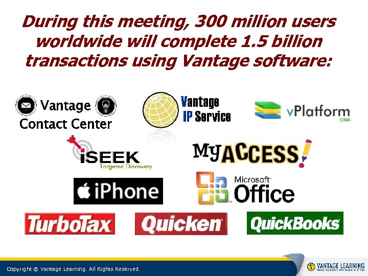 During this meeting, 300 million users worldwide will complete 1. 5 billion transactions using Vantage software: Vantage Contact Center Copyright © Vantage Learning. All Rights Reserved. Vantage IP Service