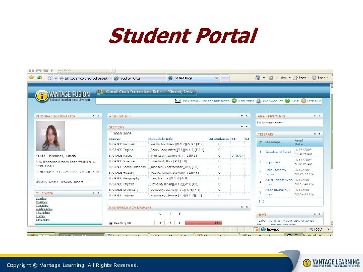 School Intelligence System Core Components: Student/Parent/Guardian Data Management School/District Data Management (Calendar/Term) Course/Section Management Staff Data Management (Authorizations) Scheduling Optional Components: Attendance School Nursing Authorization Counseling Services Gradebook Library Transportation Teacher Portal HR and Financials Student/Parent Portal Fee Management Communications Copyright © Vantage Learning. All Rights Reserved.