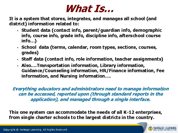What Is… It is a system that stores, integrates, and manages all school (and district) information related to: • Student data (contact info, parent/guardian info, demographic info, course info, grade info, discipline info, afterschool course info…) • School data (terms, calendar, room types, sections, courses, grades) • Staff data (contact info, role information, teacher assignments) • Also…. Transportation information, Library information, Guidance/Counseling information, HR/Finance information, Fee information, and Nursing information…. Everything educators and administrators need to manage information can be accessed, reported upon (through standard reports in the application), and managed through a single interface. This one system can accommodate the needs of all K-12 enterprises, from single charter schools to the largest districts in the country. Copyright © Vantage Learning. All Rights Reserved. 6