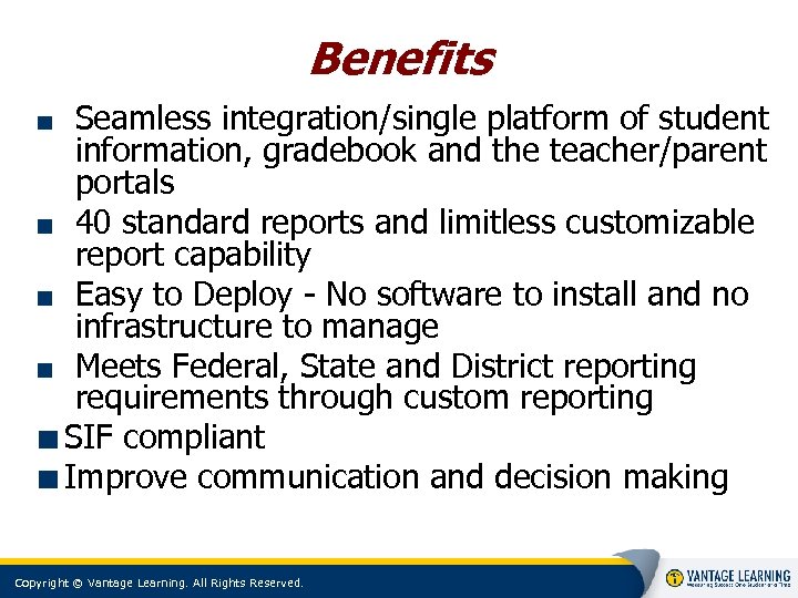 Benefits Seamless integration/single platform of student information, gradebook and the teacher/parent portals 40 standard reports and limitless customizable report capability Easy to Deploy - No software to install and no infrastructure to manage Meets Federal, State and District reporting requirements through custom reporting SIF compliant Improve communication and decision making Copyright © Vantage Learning. All Rights Reserved.
