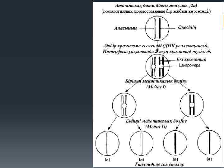2 n 4 c – Жасушаның генетикалық мінездемесі n – хромосома саны с–хроматид саны (мөлшері, көлемі) § (гректің meiosis - кішірею) – гаплоидты хромасомалары бар жасушалардың түзілуін қамтамасыз ететін, бөлінудің ерекше түрі. § Мейоз екі бірінен соң өтетін жасушалық бөлінуді құрады: мейоз І (бірінші бөліну) және мейозІІ (екінші бөліну). § Мейоз –бұл жыныс жасушаларының бөлінуі. Мейоз нәтижесінде, бір аналық біріншілік жыныс жасушаларынан (2 n 4 c) диплойдты – хромосома жиынтығы екі есеге қысқарған (1 n 1 c) төрт жасушалар түзіледі. Яғни, осы бөліну арқылы гаплоидты жыныс жасушалары: жұмыртқа жасушалары мен сперматозойдтар және өсімдік споралары түзіледі. Мейоздық бөлінудің алдында митоздық бөліну сиақты интерфазалық кезеңнен өтеді.