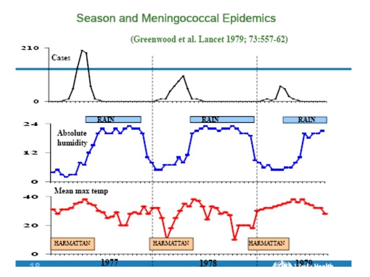 Why do we think Weather is a Risk Factor for Meningitis? § Meningitis in Africa is largely, though not entirely, confined to regions with a defined dry season § Meningitis epidemics always occur in the dry season § Meningitis is culturally associated with dust, which is seasonal (in fact, in many languages the name for meningitis is “sand disease”) § Meningitis epidemics end abruptly with the start of the rainy season
